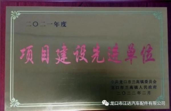 龍口江達汽車配件有限公司 被授予項目建設先進單位
