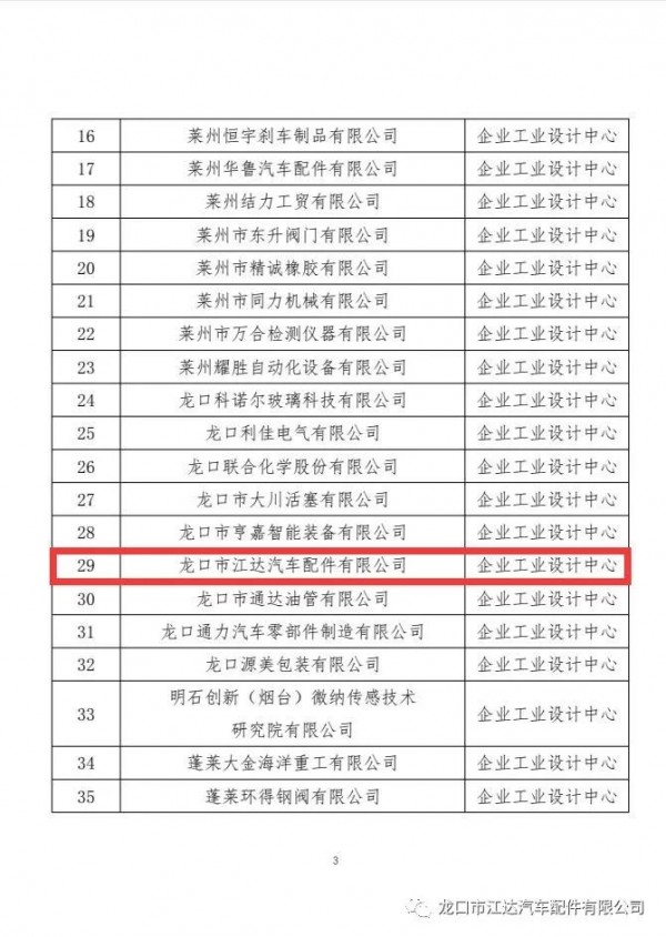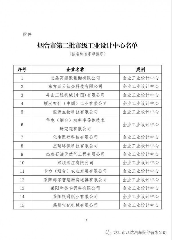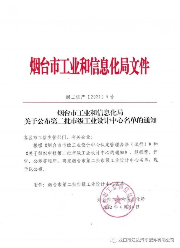 近日,煙臺市工業(yè)和信息局正式公布第二批煙臺市工業(yè)設(shè)計中心名單,龍口市江達汽車配件有限公司榜上有名,被確定為“煙臺市工業(yè)設(shè)計中心”。