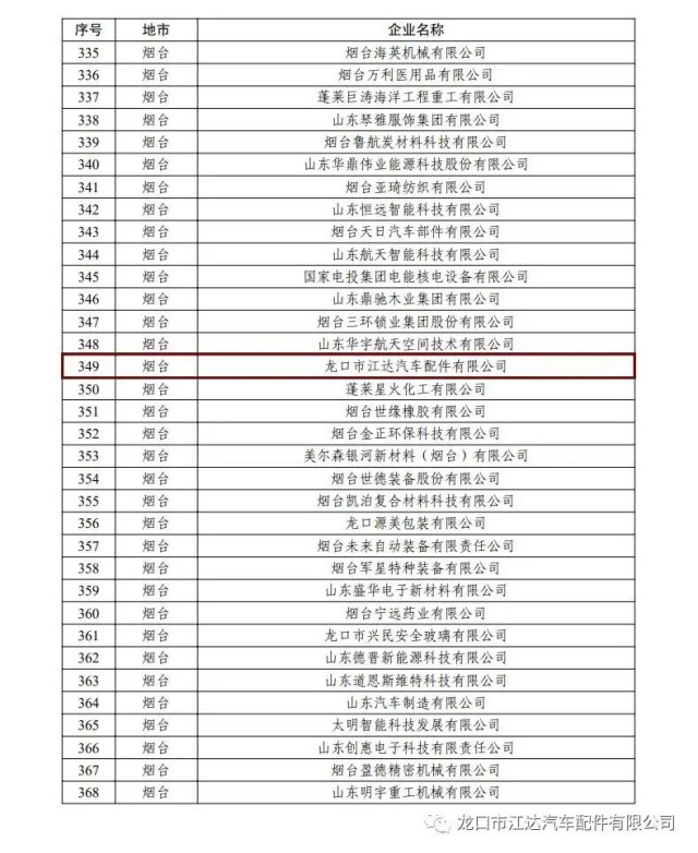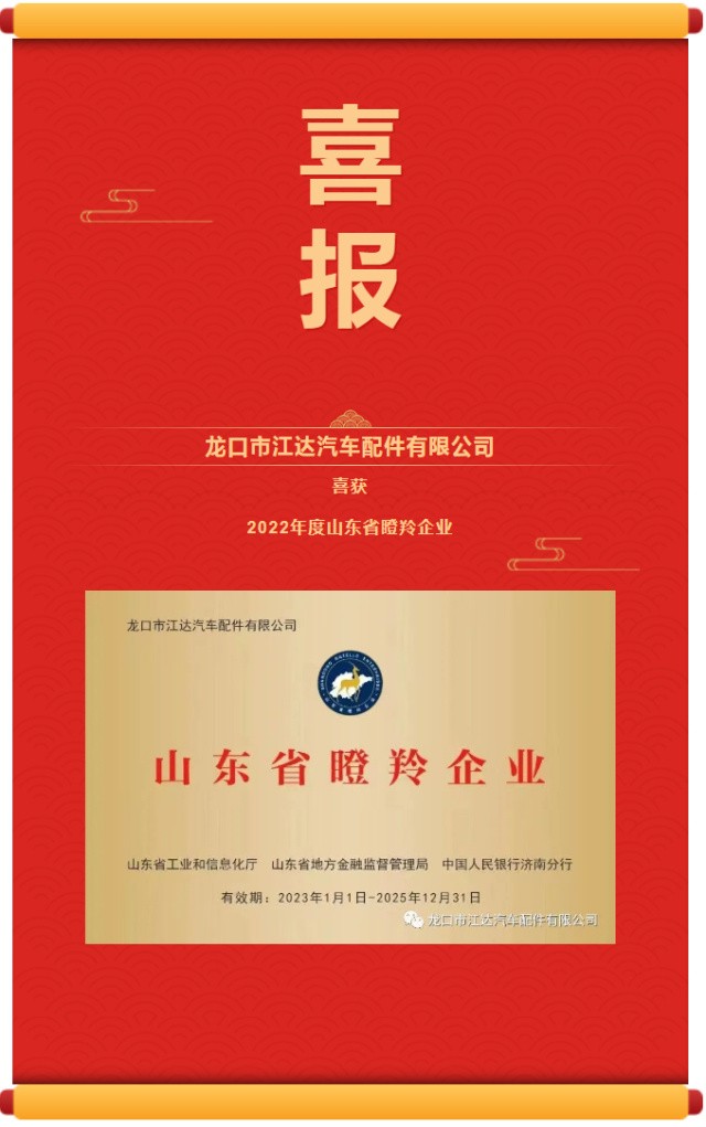 2022年7月19日,山東省工業(yè)和信息化廳公布了2022年度“山東省瞪羚企業(yè)”名單, 龍口市江達(dá)汽車配件有限公司榜上有名,榮膺“山東省瞪羚企業(yè)”稱號。
