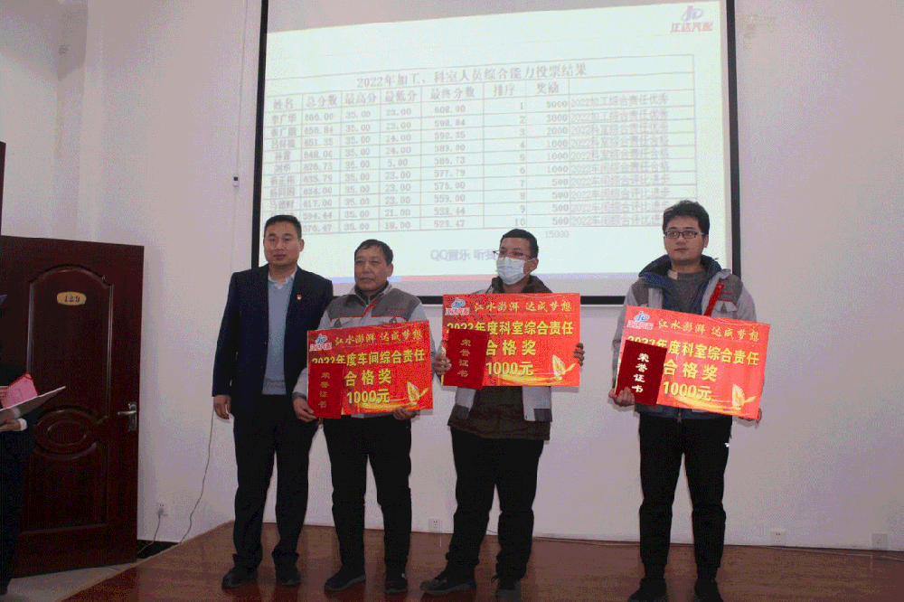 會上,牛純強董事長作重要講話。全面總結了2022年江達公司主要工作,肯定了所有江達人一年來所付出各項努力以及所取得的成績,成績只代表過去,征途漫漫,惟有奮斗,我們要以只爭朝夕的決心和意志,才能不負時代,不負韶華。董事長全面部署了2023年各項主要工作,為我們指明了前進的方向,我們將繼續(xù)實施管理創(chuàng)新、質(zhì)量創(chuàng)新、技術創(chuàng)新,以高質(zhì)量發(fā)展為目標,共同抒寫嶄新的篇章。