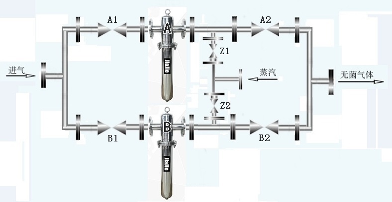 1. 安裝時,必須按照過濾器上的空氣進出口標簽連接好管道。否則將進出口反裝會嚴重影響過濾效果。為了便于使用和更換維修,過濾器應按下圖所示的標準管線進行安裝。